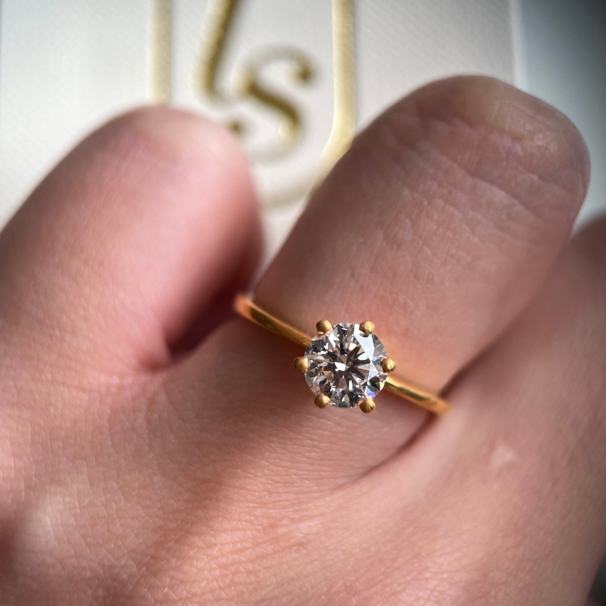 The Manila Solitaire engagement ring is always a classic! Featuring a 6-prong Round Brilliant cut gorgeous center stone on a sleek band.
